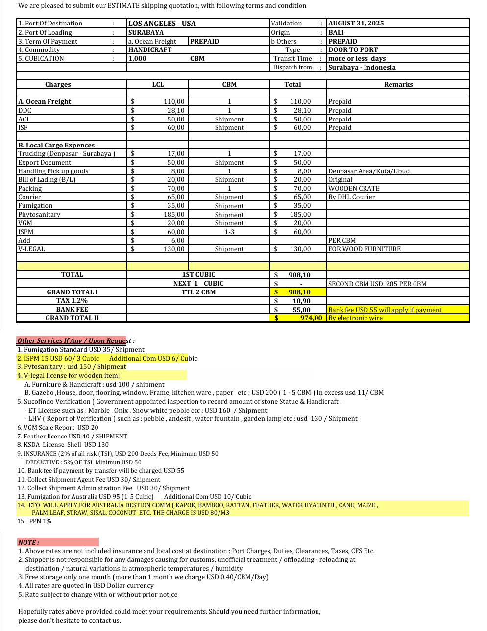 • Shipping cost: it starts from $1,000 for the first cubic meter and from $200 for each additional cubic meter within the same shipment